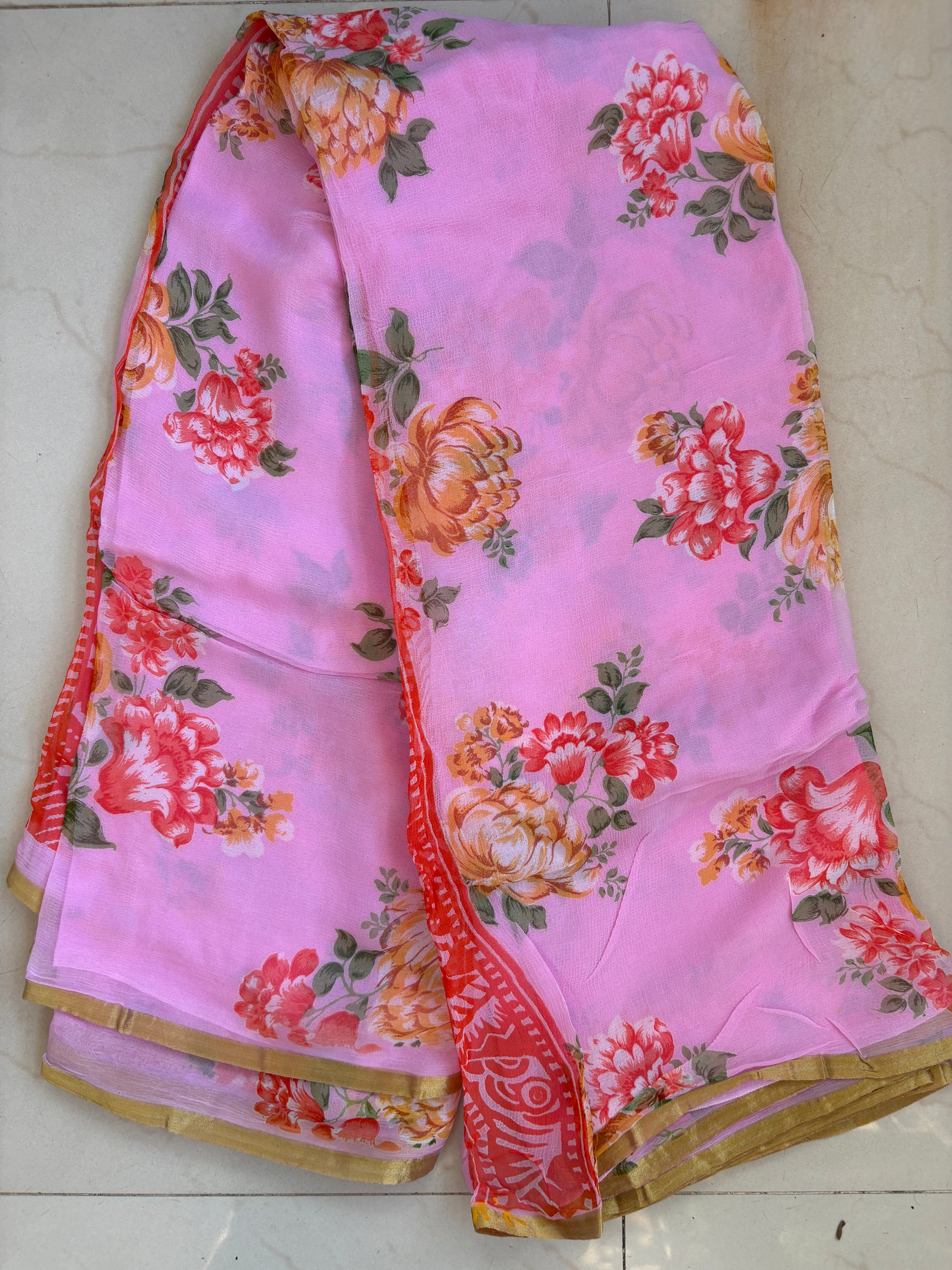 Sadabahar Chiffons; This is a beautiful flower printed royal chiffon saree. A stunning, lightweight, breezy saree making it perfect for the all seasons.